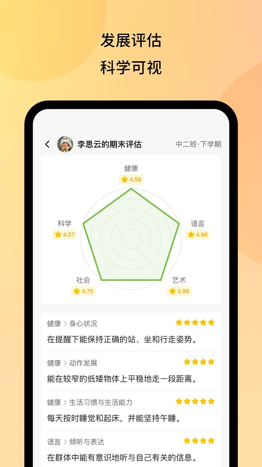 3、查看孩子在健康、语言、社会、科学、艺术五大领域的能力分析报告,家园携手共同制定符合孩子个性特点的培养方案。