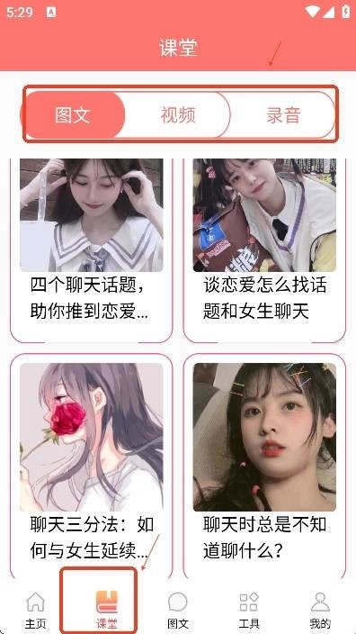 3、男生们也能借助课堂板块里的图文、视频和音频,更直观地学习恋爱技巧。