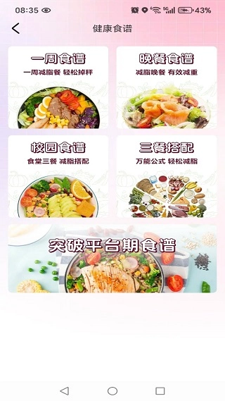 3、点击查看健康食谱,我们可以了解到一周食谱、三餐搭配等各类不同的方案。