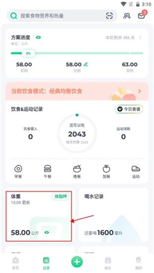 1、进入到应用之后找到记录页面点击体重选项。