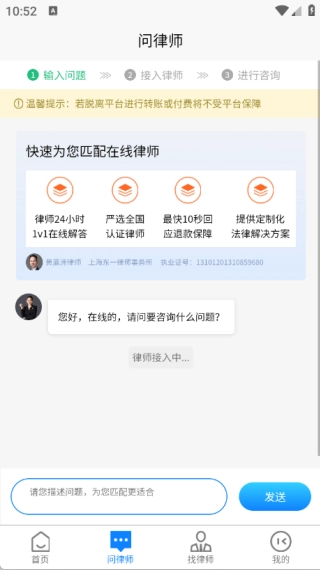 当用户遇到法律相关问题时,随时都能打开这款应用,在线向专业律师咨询并获取免费解答,整个过程无需提前进行预约。