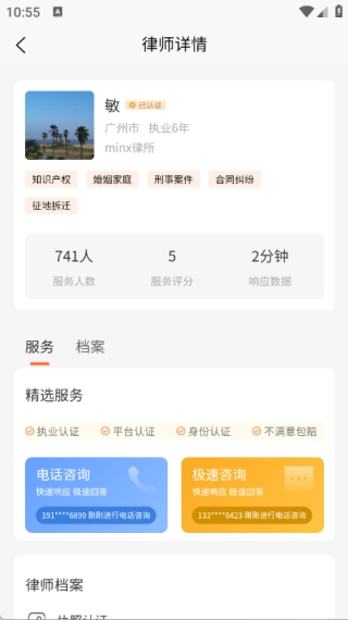 4、可以查看律师详情,随时进行精选服务,还可以进行电话咨询和极速咨询。