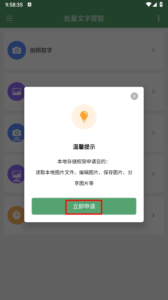3、例如进入“图片取字”功能,点击“立即申请”按钮,并授予相关权限以允许访问。