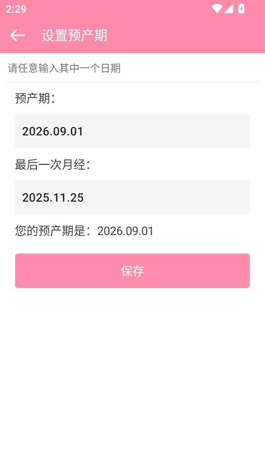 2. 接下来进入“设置预产期”界面,填写相关信息后点击“保存”按钮,即可进入下一步操作。