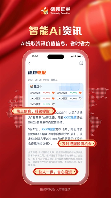 德邦证券是一款专业的手机证券理财应用,整合了行情交易、理财商城、投顾投教、7x24小时实时资讯等多元功能,更配备AI选股、智能诊股、智能盯盘、智能条件单等实用工具,助力投资者选股、交易的投资困境!用户可在此开展融资融券业务,涵盖担保品买卖、融资买入、融券卖出、还款(卖券还款、直接还款)、还券(买券还券、直接还券)、信用银证转账、信用业务查询等全流程操作,让投资模式实现升级,助财富增长突破牛熊市的周期限制。