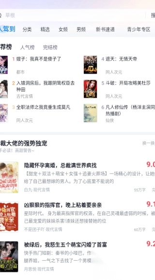 女性向热门作品:《萌妻食神》《凤囚凰》《夜天子》《绝世盛宠:腹黑宝宝嚣张娘》《神医太子妃》《萌宝甜妻》等爱情小说,恋爱季节已至,为你编织浪漫绮梦。