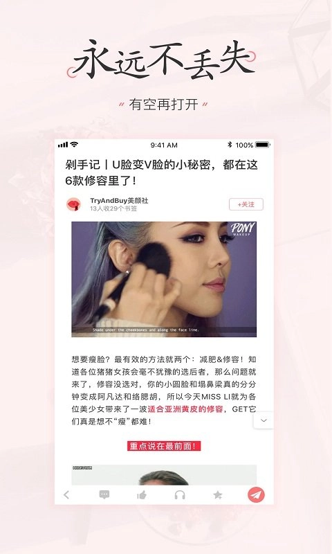 美书签软件,让收藏不再“石沉大海”!睡前刷微博时刷到超实用的美妆技巧,难道要立刻爬起来尝试?下班路上刷小红书被漂亮裙子狠狠种草,难道要马上冲动下单?当然不!我们总会先点下收藏,可之后……就没有之后了……但有了美书签,不管是在微博、微信、小红书,还是头条、抖音、淘宝,甚至是任何App上看到的心动好物,都能一键集中收藏到美书签里,再也不怕收藏夹吃灰啦!