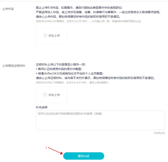 3、接着在认证页面填写个人信息以及作品,提交认证后等待认证信息的回复。