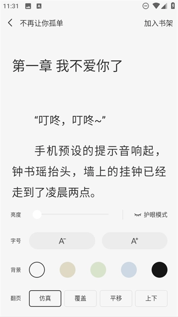 5、在阅读界面,用户还能够根据自己的需求自定义调整字号大小、背景颜色以及翻页方式等设置。