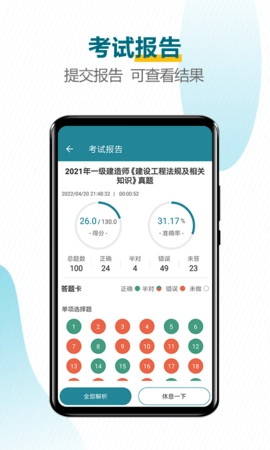 在考试功能设计上,该软件支持在线模拟考试场景,可自动记录每道题的作答时长,考试结束后会即时生成一份包含总用时、各题型准确率等核心数据的详细分析报告。针对错题管理,软件具备自动收纳功能,便于用户后续针对薄弱环节进行专项强化复习。此外,软件了一级建造师与二级建造师各专业科目近年度的考试真题题库,能高度还原真实考试环境,助力用户精准把握命题趋势、熟悉真题命题规律,并逐步提升解题技巧的运用熟练度。