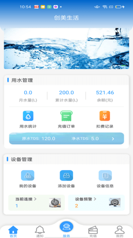 创美生活是创美科技旗下运营的生活大管家式系列产品的用户终端,核心功能在于提供智能纯净水表的计费计量服务。用户借助该软件,能够便捷地添加和分享智能水表,实时掌握智能水表的使用详情,清晰了解原水与纯净水TDS值的对比情况,还可以查看用水记录等相关信息。