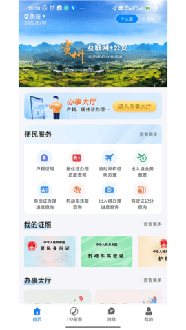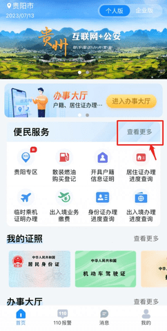 1:安装“贵州公安”并打开,首页点击“查看更多”