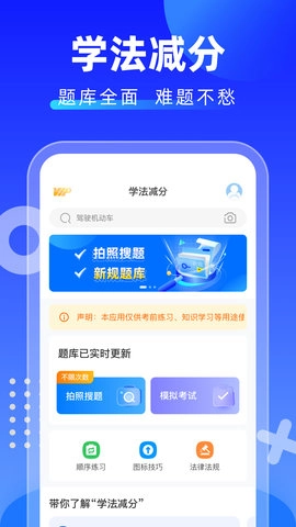 学法减分拍照搜题具备拍照搜题、文字搜题、语音搜题、考前练习以及模拟考试等多项功能。其中,拍照搜题能够借助拍照识别试题,实时同步更新学法减分考试题库,并且提供准确率高、搜题速度快的服务;文字搜题可通过输入文字描述试题,迅速找到相关题目;语音搜题则能通过语音输入试题内容,让题目搜索更加方便快捷。考前练习功能结合大数据出题,覆盖了小车、客车、货车和摩托车等各类车型,全国各地区的题库也会实时更新。模拟考试功能会依据考试大纲的要求,提供仿真的模拟考试环境,助力考生攻克考试中的重难点部分。