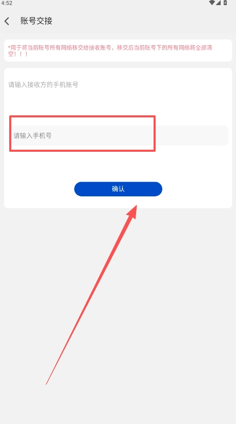 3、请输入对方用于交接的手机号码,此操作是为了将当前账号下的所有网络移交给接收账号,移交完成后,当前账号下的所有网络信息将被全部清空。