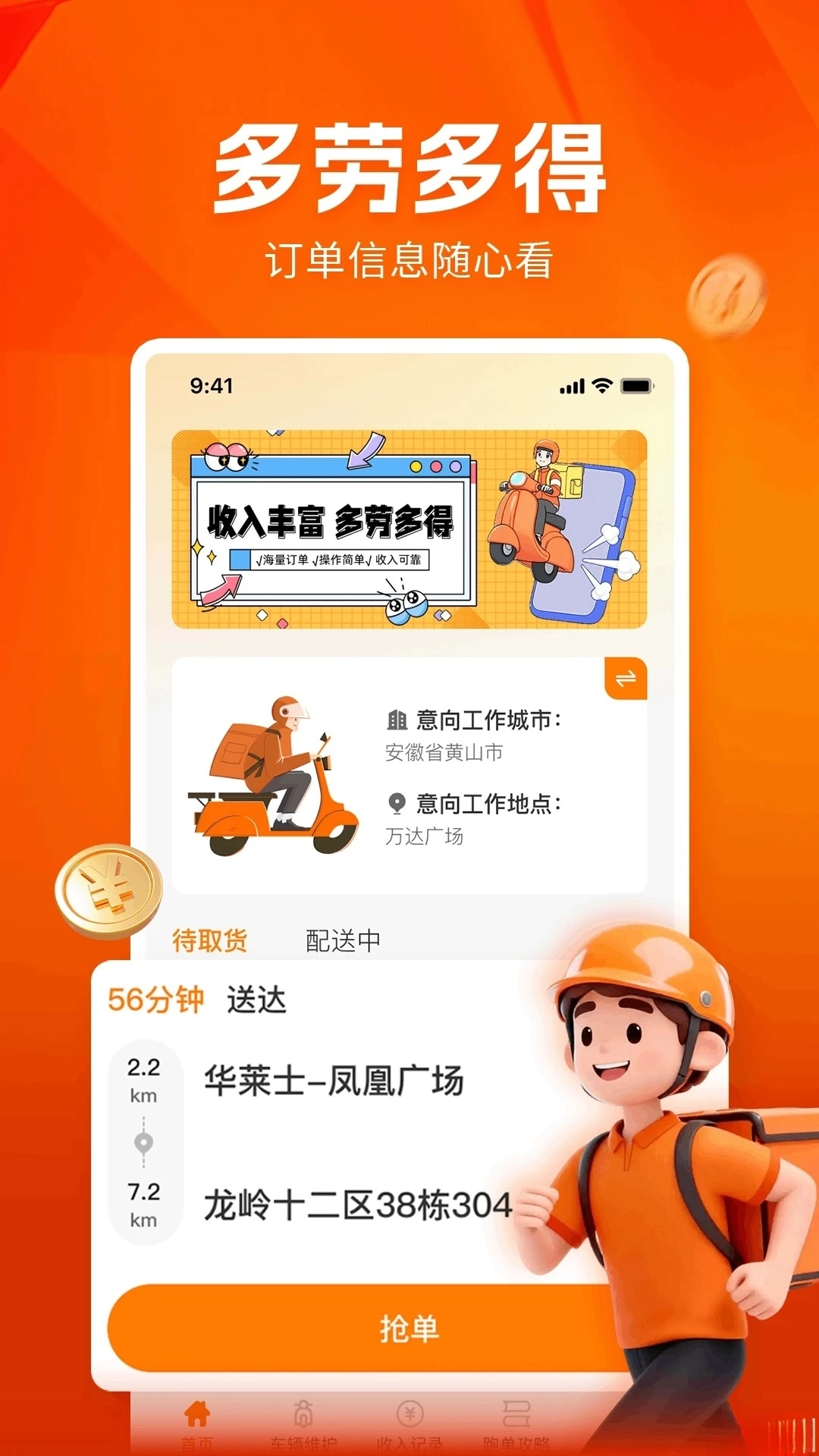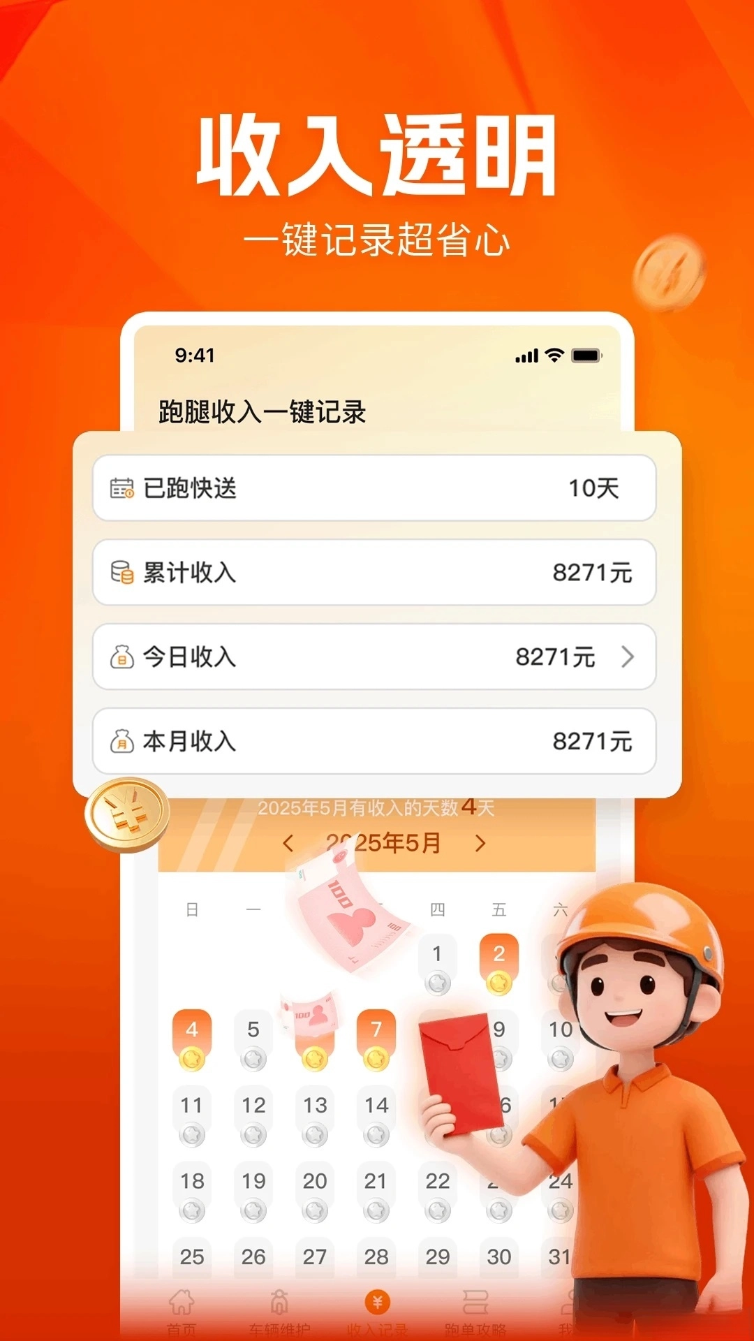 一键收入记录功能:助力简化财务处理流程,骑手无需手动核算收入,系统会自动汇总每日的收入情况,还支持将数据导出为报表,方便后续进行报税和报销操作。