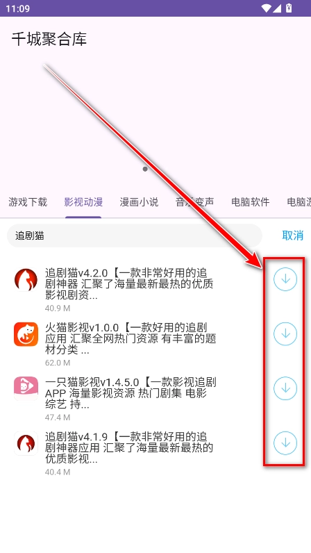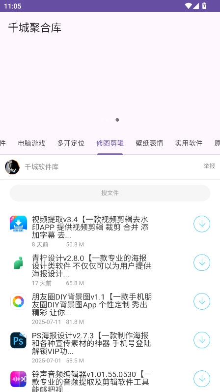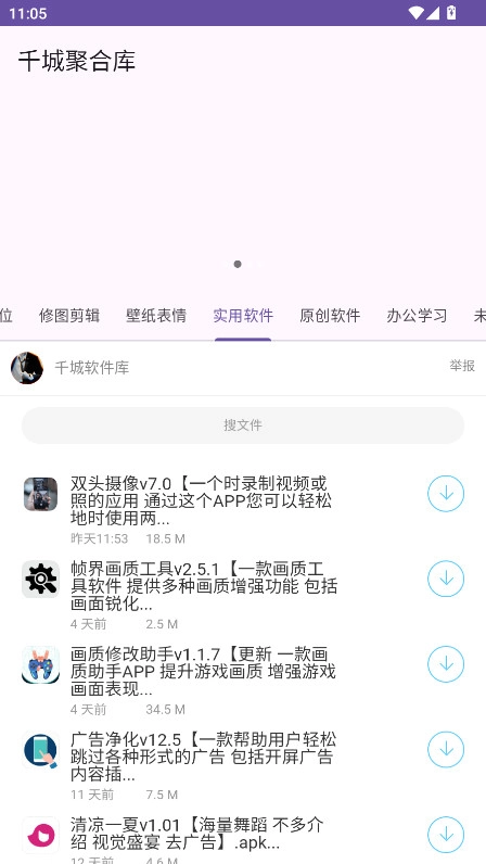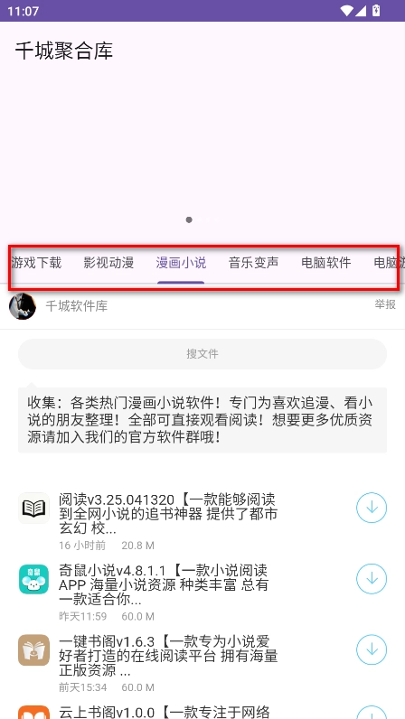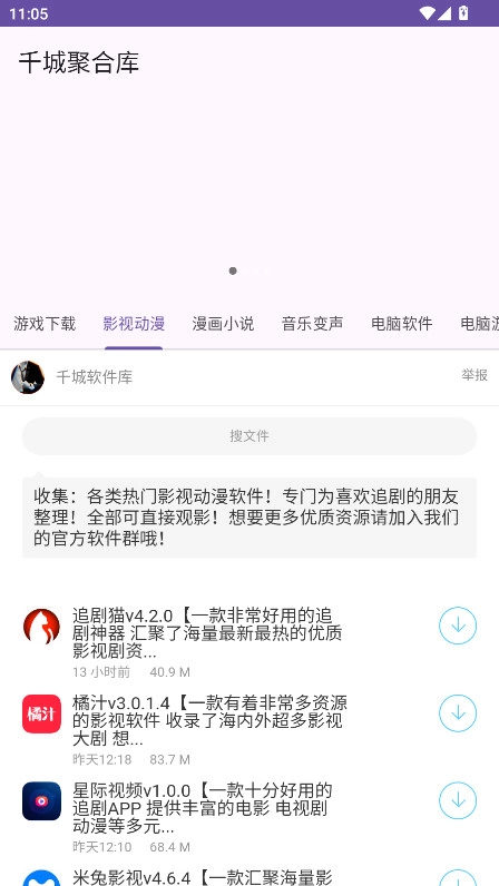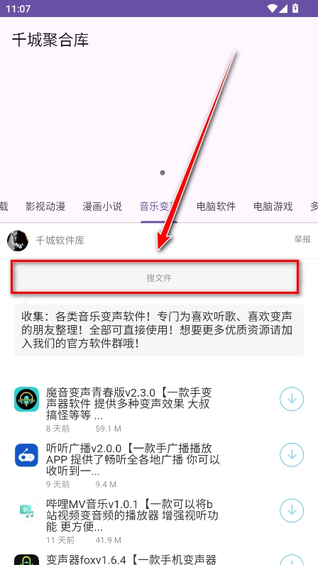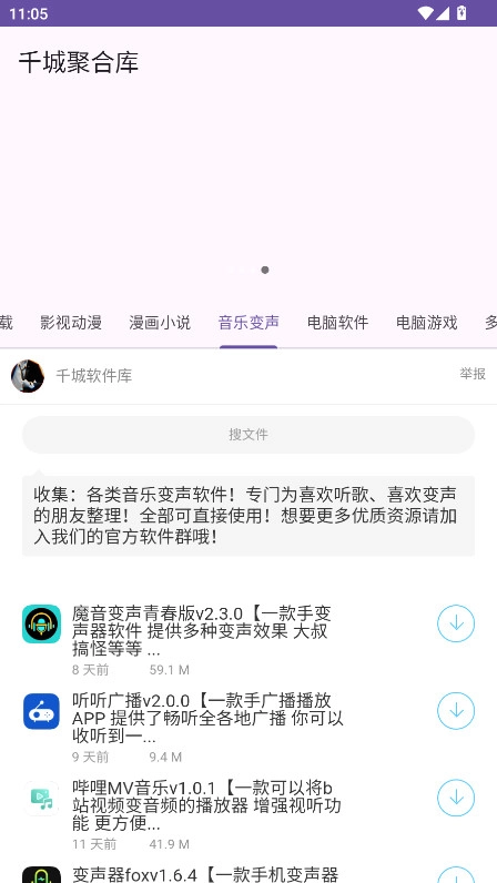 1.进入千城聚合库,主页设有游戏、影视动漫、漫画小说、音乐变声、实用软件等板块,点击各板块就能浏览对应的分类内容。