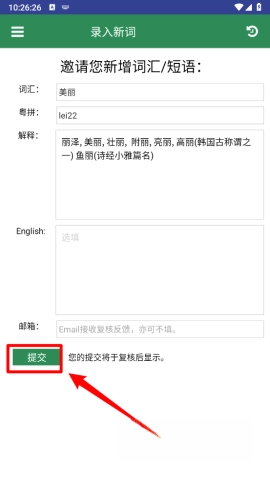 4、接着输入你所需的词汇及其相关解析,点击“提交”按钮即可。提交完成后请稍作等待,待审核通过,相关内容就会在系统中展示出来。