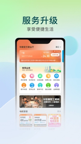 它还推出了一系列便民服务,助力用户畅享更便捷的生活体验。华数营业厅升级服务已覆盖省网用户群体,用户能够不受时间地点限制,在线完成业务查询与办理,操作流程简单高效。华数TV整合了智家服务功能,用户可借助华数TV实现全屋智能设备的便捷互联操控。此外,华数TV还提供广电5G靓号申请、特惠套餐挑选等服务,同时上线城市便民服务板块,用户能轻松选购商城优质商品,让日常生活更省心省力。