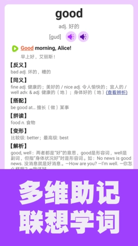 这款软件不仅依托专业背景开发,更融合先进技术与理论助力学生记忆单词。初中英语单词通借助游戏化学习模式与多维度记忆方法,让学生在轻松愉悦的氛围里高效背单词。难度分级控制及丰富学习功能,使学习更具个性化与趣味性,还能调动视觉、听觉、口语、手势等多感官记忆,进一步提升学习乐趣与效果。