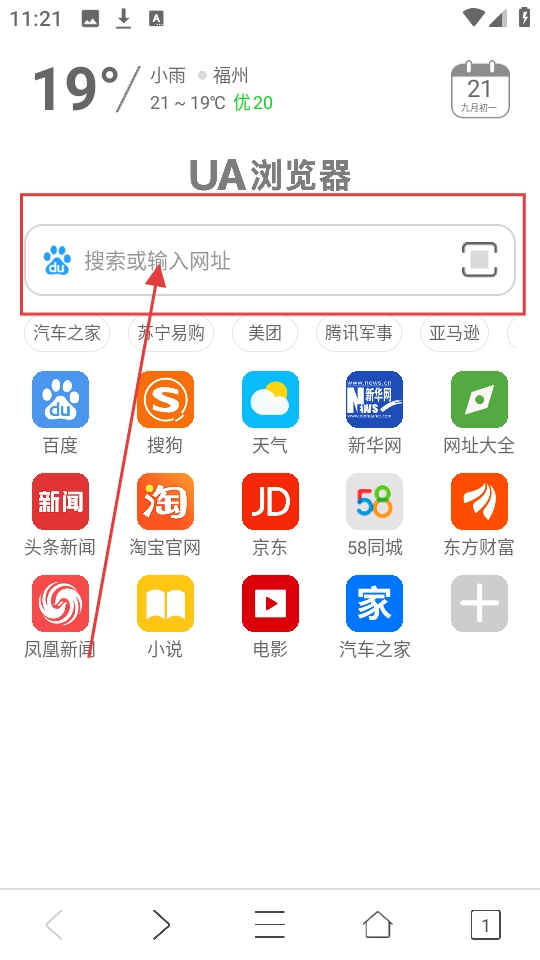 在UA浏览器的首页,找到【搜索或输入网址】的输入框并点击,接着输入想要查找的内容或具体网址,这样就能进行搜索操作或者直接访问对应的网页了。