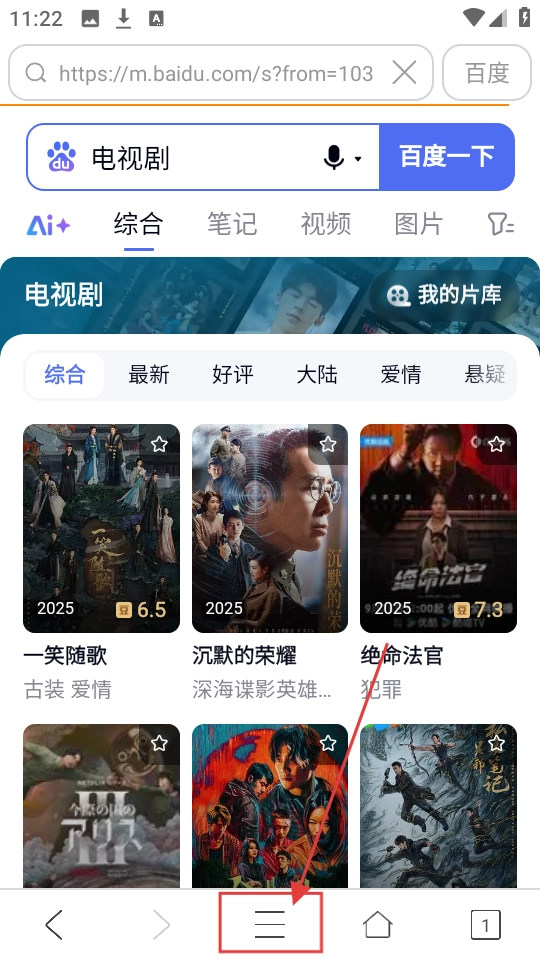 2、搜索到内容后,点击底部的三横线按钮,即可展开功能菜单,查看浏览器的更多功能。