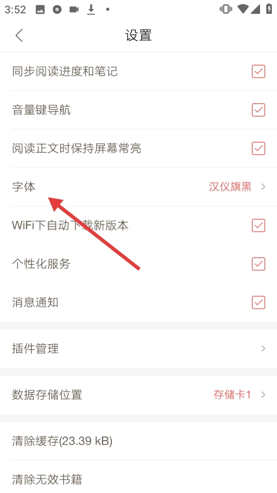 3、在设置界面,点击【字体】选项进入字体设置页面。