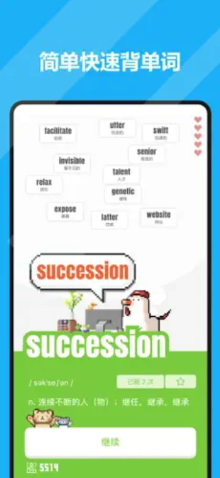 干词是一款专为学生用户打造的安卓背单词应用,它能助力学生快速记忆英文单词。软件拥有精致的界面设计和丰富的卡通动画效果,让原本单调的背单词过程变得生动有趣。词库涵盖了从基础到进阶的各类英文单词集合,学生可以依据自身所处的学习阶段,自由选择适合的内容进行学习,从而逐步掌握高效记忆英文单词的方法。