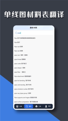 管工宝最新版本的功能十分全面,主要体现在以下几个方面:其一,针对各类工况的管道计算功能,用户能依据不同施工场景挑选对应的计算工具,迅速获取精准结果;其二,具备材料表翻译功能,覆盖中英文对照、标准对照与材质对照,助力用户消除材料选择时的语言障碍;此外,软件提供图文及视频资料,可帮助用户快速掌握管道施工技能;同时,软件还包含三角计算等基础测量工具,便于用户开展日常测量与计算工作。