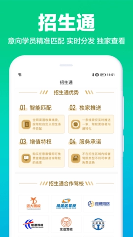驾校通推出了招生通服务,为驾校提供品牌招生支持。该服务可独家推送享有专属特权的意向学员,并通过智能精准匹配,切实解决驾校的招生困境。作为一款功能多样的驾考应用,驾校通不仅能助力驾校和教练招生难题,还能提高教学质量、管理效能与服务水准。借助驾校通,驾校和教练能够更高效地管理学员档案、统计招生数据、记录考试分数、生成财务报告以及评估员工业绩。