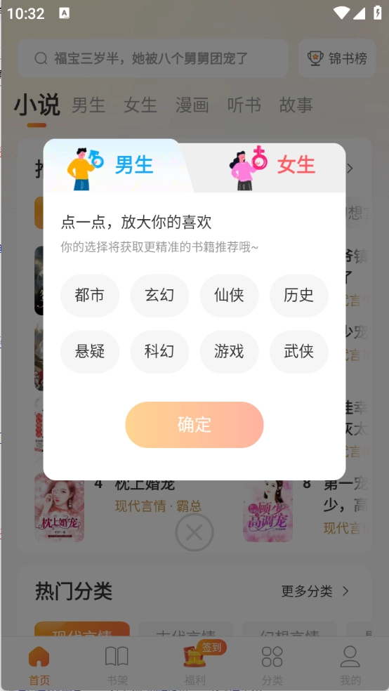 进入后选择性别,系统就能为用户精准推荐小说和漫画资源。