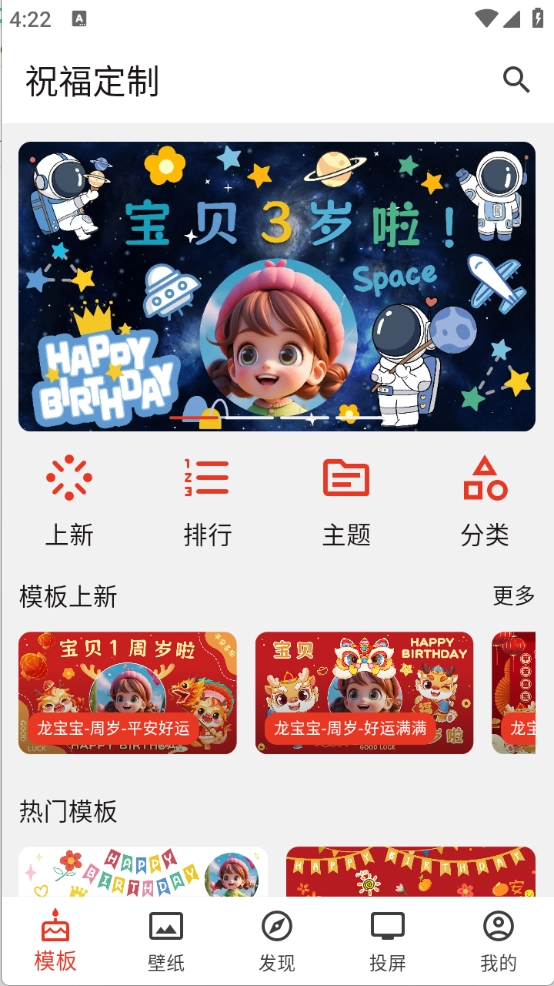 祝福定制是一款能轻松制作各类祝福图片的软件,涵盖生日祝福、新年祝福、乔迁祝福等多种类型。软件内所有工具均免费开放使用,用户可挑选心仪的模板进行创作,同时还有大量免费祝福壁纸可供选用。此外,该软件支持将制作好的祝福图片投屏到设备上,并且能帮助用户快速找到所需的模板。