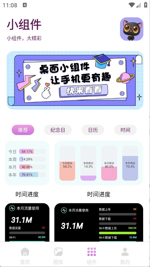 4、“组件”页面涵盖了纪念日、日历和时间等各类组件样式。