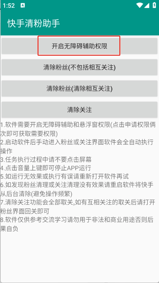1、软件运行需要开启无障碍辅助权限与悬浮窗权限(点击两次“申请权限”按钮即可获取所需权限)
