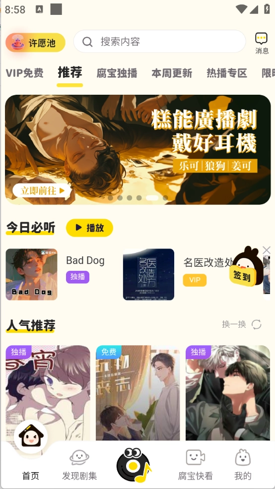 首页整合了当下热门的广播剧集,顶部导航栏还设有细致的分类板块。