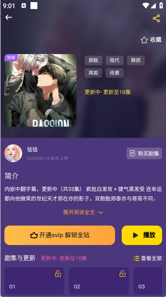 4、点击想要收听的广播剧进入详情页面后,就能开展播放和收藏操作。