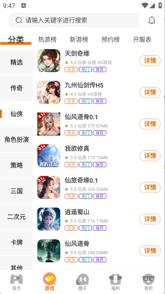 3、游戏栏目对游戏进行了详细归类,涵盖了仙侠、传奇以及射击等类型。