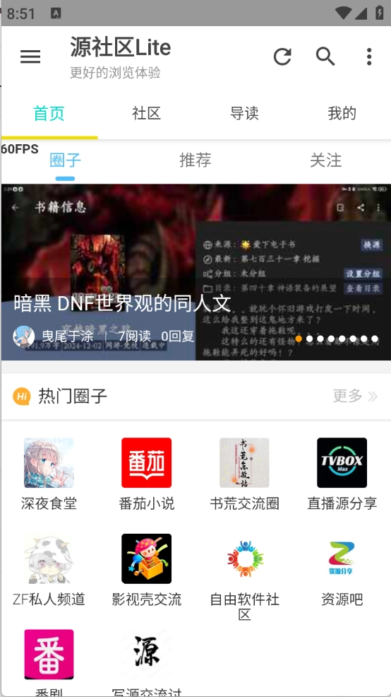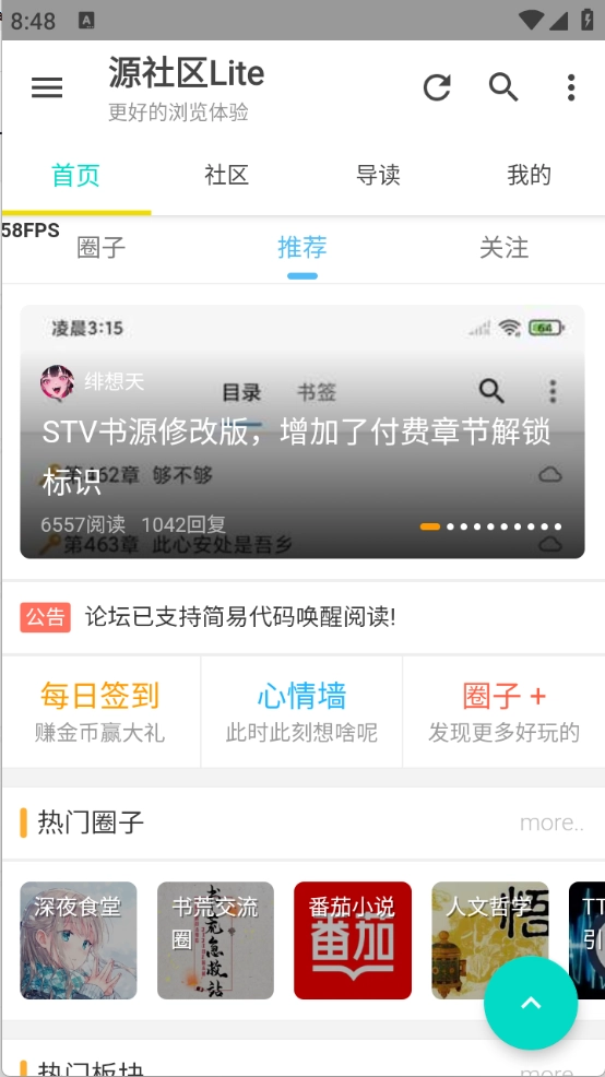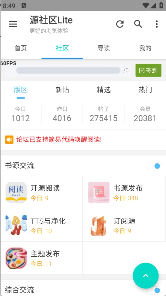 进入首页后,用户能看到丰富的资源板块,像社区、导读等都包含在内,也可通过关键词开展搜索。