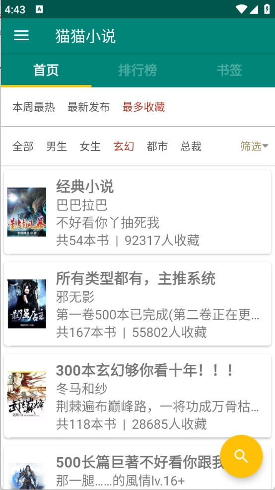 2、进入首页后,小说被划分成了玄幻、都市、悬疑等多种详细类别。