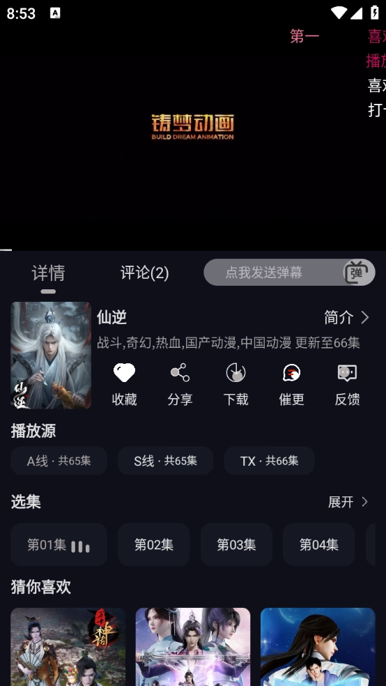 5、点击动漫进入详情页面后,能够选择集数、播放源,还可以进行收藏、分享等操作。