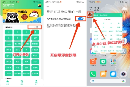 1、打开小开关,开启悬浮窗权限,点击小篮球收回窗口。