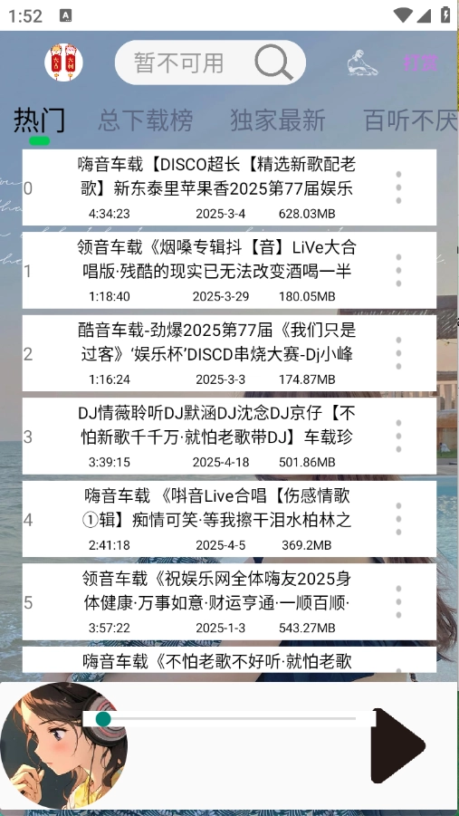 dj乐听平台汇聚了海量音乐资源,涵盖总榜热歌、独家新歌以及无损音质等多种类别。用户只需直接点击心仪的曲目,即可免费畅享音乐盛宴,所有资源均不收取任何费用。无论何时何地,都能轻松开启便捷的听歌体验,而且平台的音乐资源更新迅速,让你随时都能沉浸在喜爱的旋律中。