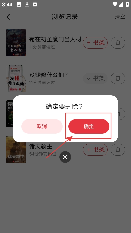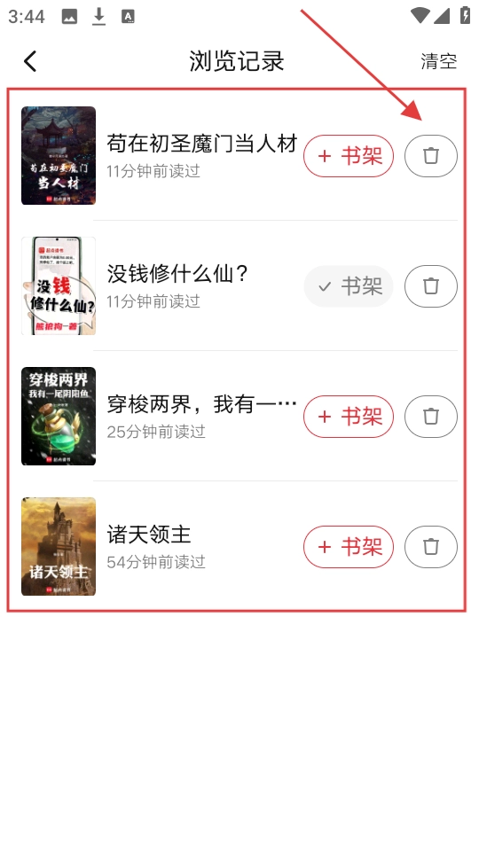 3、进入浏览记录页面后,你可以查看之前浏览过的书籍;要是想删除某条记录,只需点击对应书籍旁边的垃圾桶图标即可。
