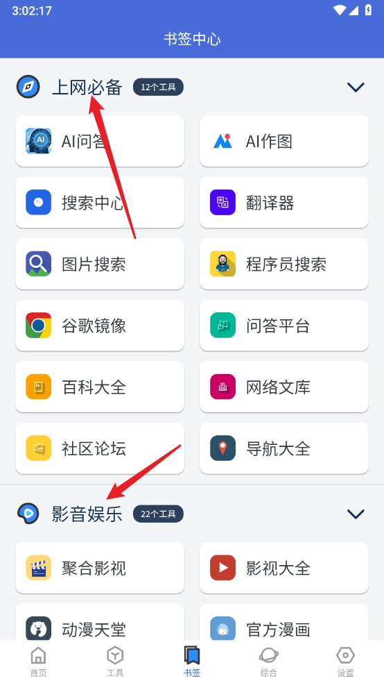 5、在书签板块,涵盖了上网必备、影音娱乐等功能,一键即达使用。