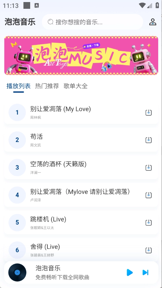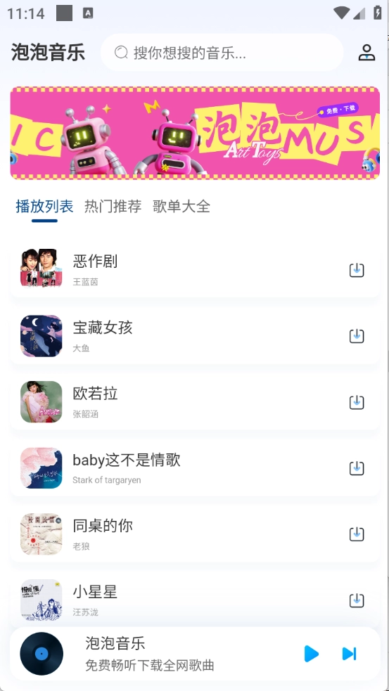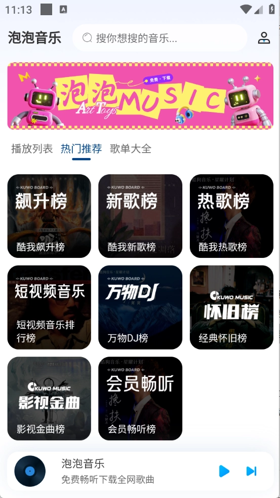泡泡音乐专为音乐爱好者打造,是一款集丰富曲库于一体的听歌利器。这里汇聚了海量音乐资源,无论是当下热门新歌,还是经久不衰的经典老歌,应有尽有。每首收录的歌曲都经过精心筛选,契合大众喜好;同时提供细致的音乐分类,助你轻松找到心仪曲目,打造专属于你的个性化听歌体验。此外,平台采用高清音效播放技术,全程无杂音干扰,让你尽享纯净音质。你想听的歌曲,在这里都能找到。