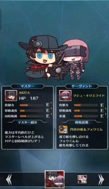游戏开始时,玩家需要进行初始御主的选择,可选范围为咕哒组(成员包括玛修与芙芙)和卡多克组(成员为皇女和奥菲利亚)。不同的御主组合具备各异的被动技能:咕哒组属于均衡类型,在防御能力、移动速度以及道具回收范围方面都处于中等水平,其被动技能是扩大回血道具的回收范围;而卡多克组的特点是防御能力较强、移动速度较快,但相应的道具收取范围会小一些。