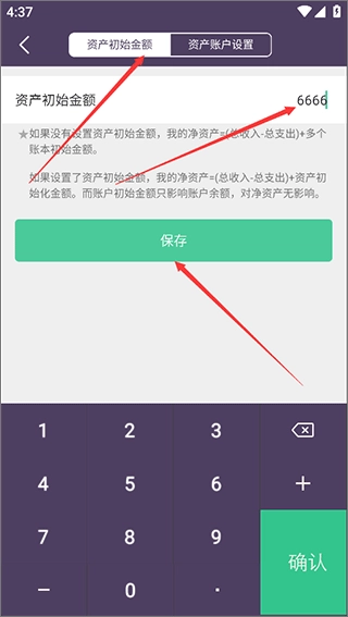 3、设置资产初始金额,输入数字,点击【保存】即可。