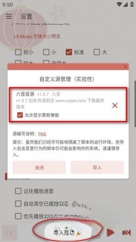 导入成功后,会出现“六音音源”,选择“关闭”;