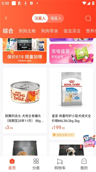 3、点击商城后会跳转页面,在首页能看到琳琅满目的宠物零食和玩具。