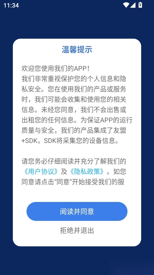 1. 第一步先打开软件,浏览“温馨提示”内容后,点击“阅读并同意”按钮进入下一步