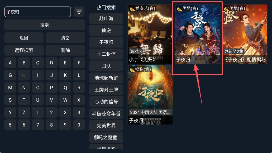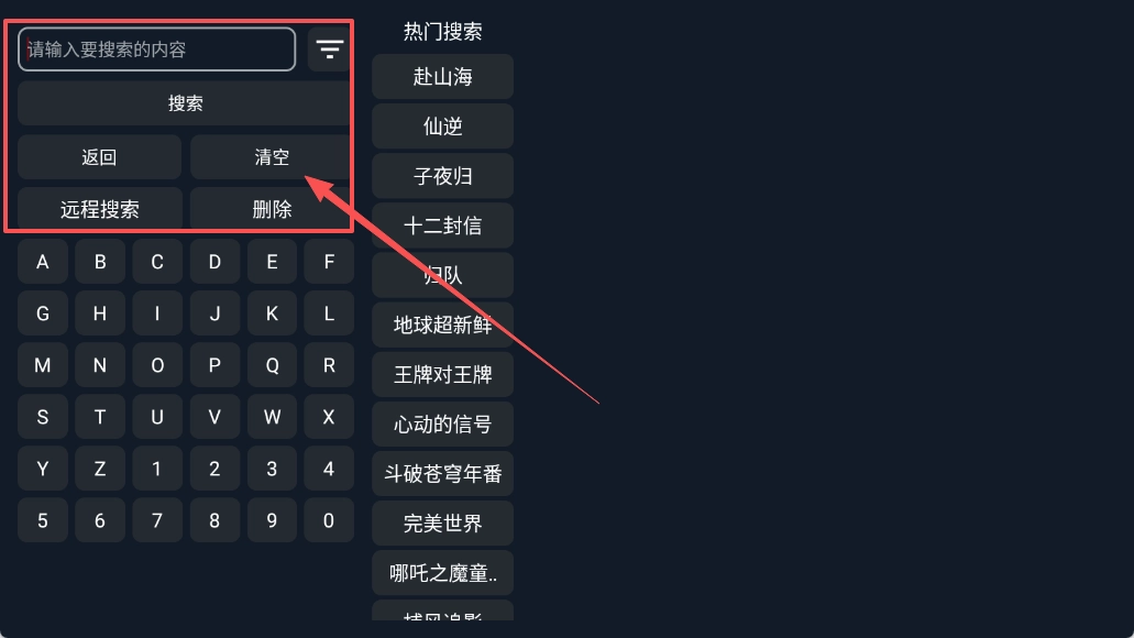 2、在搜索框输入片名,用远程搜索或者点热门搜索。